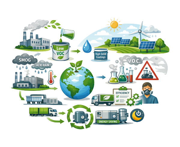 Onze focus ligt vooral op het gebied van emissiebeperking, milieuvriendelijke producten en efficiëntie. We zorgen ervoor dat het VOS-gehalte, de Vluchtige Organische Stoffen, zo laag mogelijk wordt gehouden.
