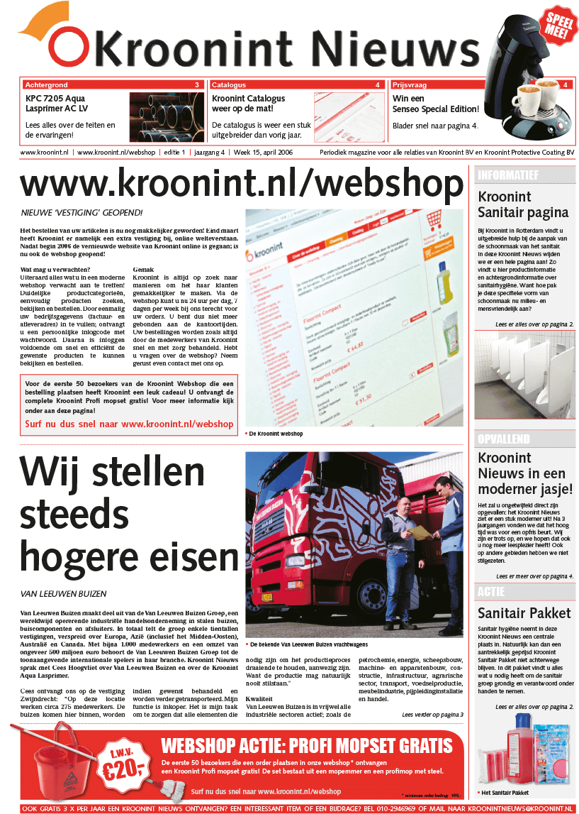 In de aanloop naar het 100-jarig bestaan heeft Kroonint BV een wezenlijke gedaantewisseling ondergaan. Van een louter productgericht bedrijf is Kroonint een overwegend vraaggerichte organisatie geworden. Met een totaalpakket van producten en systemen die qua toepassing in vier kernbegrippen zijn samen te vatten. Te weten: Onderhoud, Reparatie, Professionele schoonmaak en Organisatie.