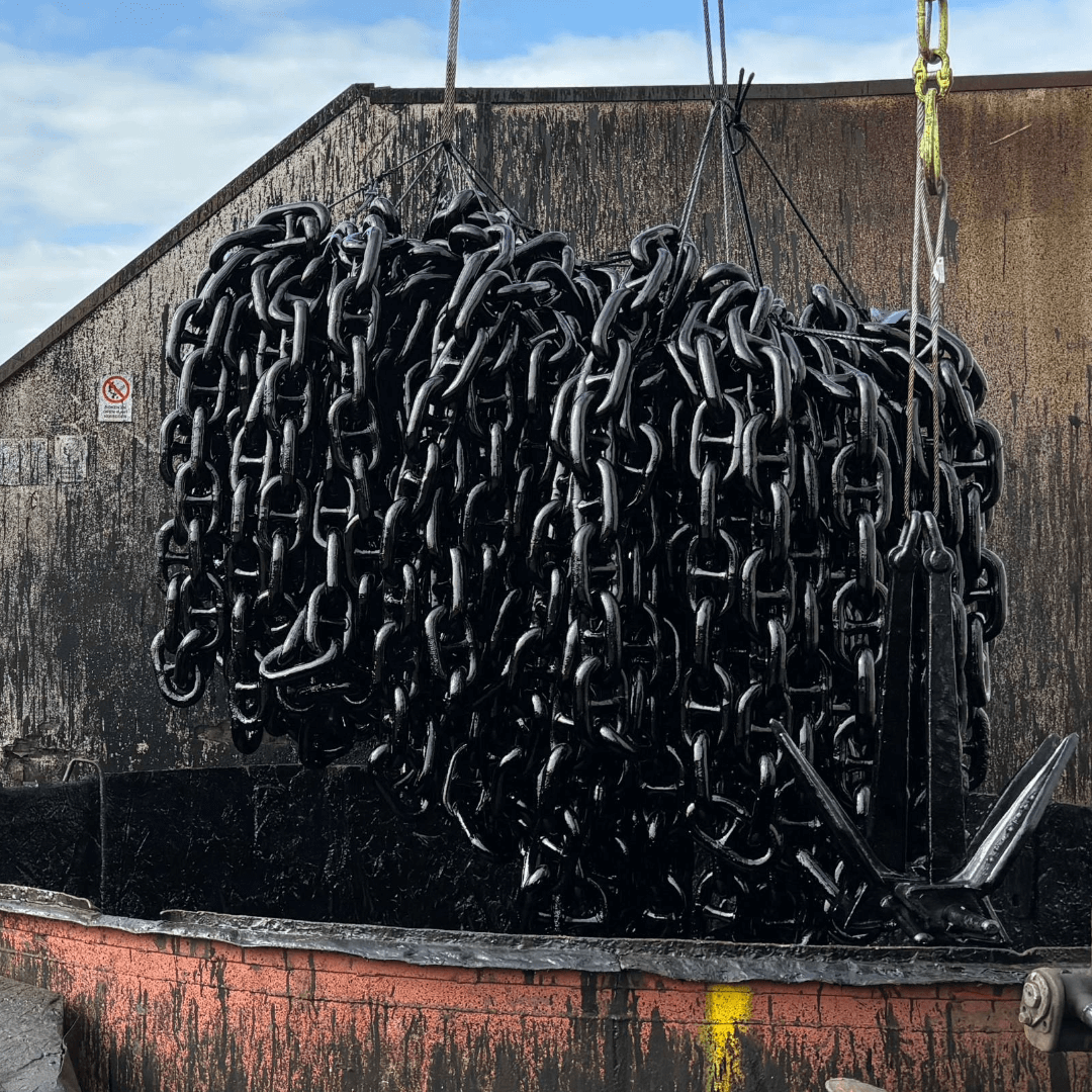 De coating word onder andere gebruikt bij industriële projecten zoals kettingbescherming, waarbij kettingen volledig worden ondergedompeld in een bad met Bitulak-coating. Dit toont de kracht en hechting van het product in praktijkomstandigheden waar extreme bescherming vereist is.